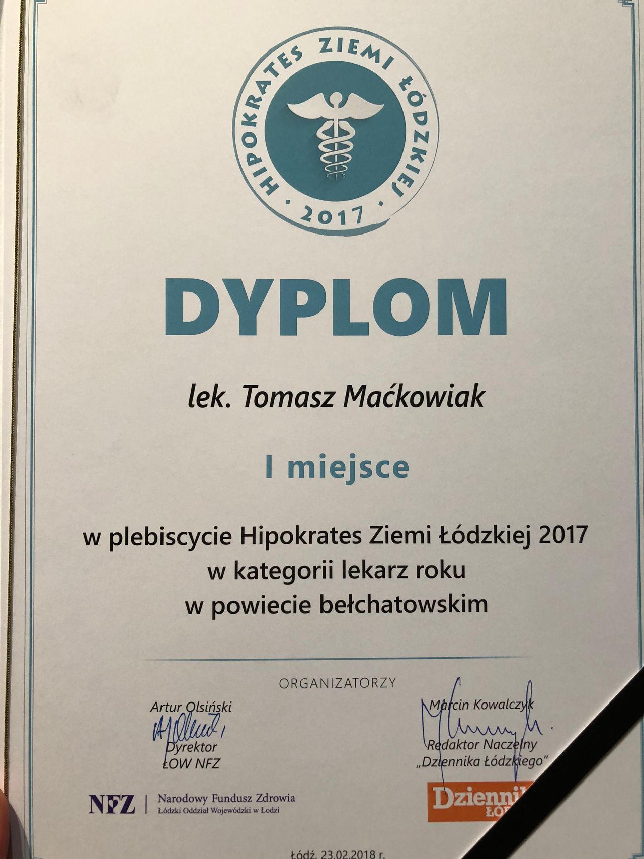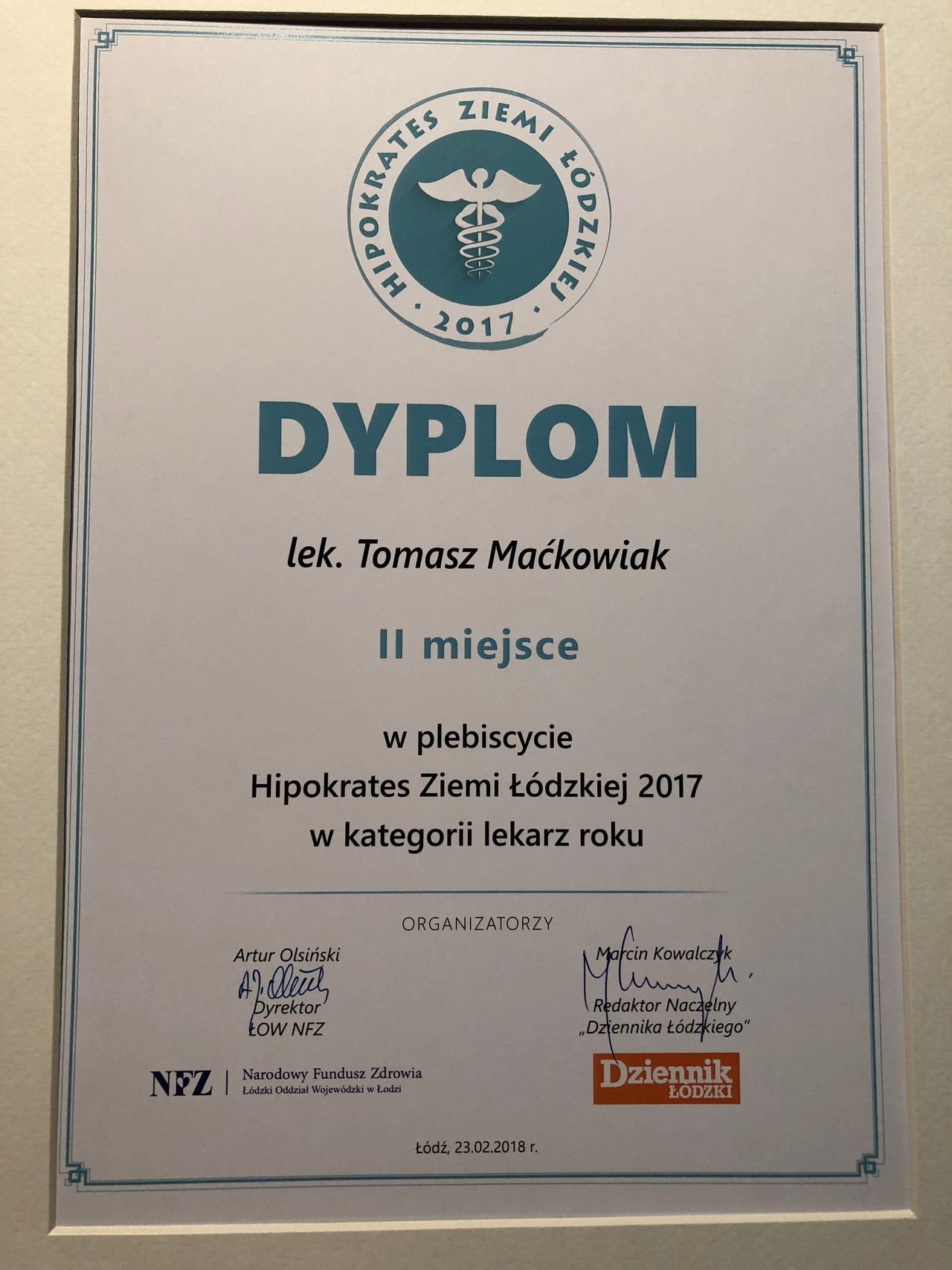 - II miejsce w plebiscycie Hipokrates Ziemi Łódzkiej 2017 w kategorii lekarz roku